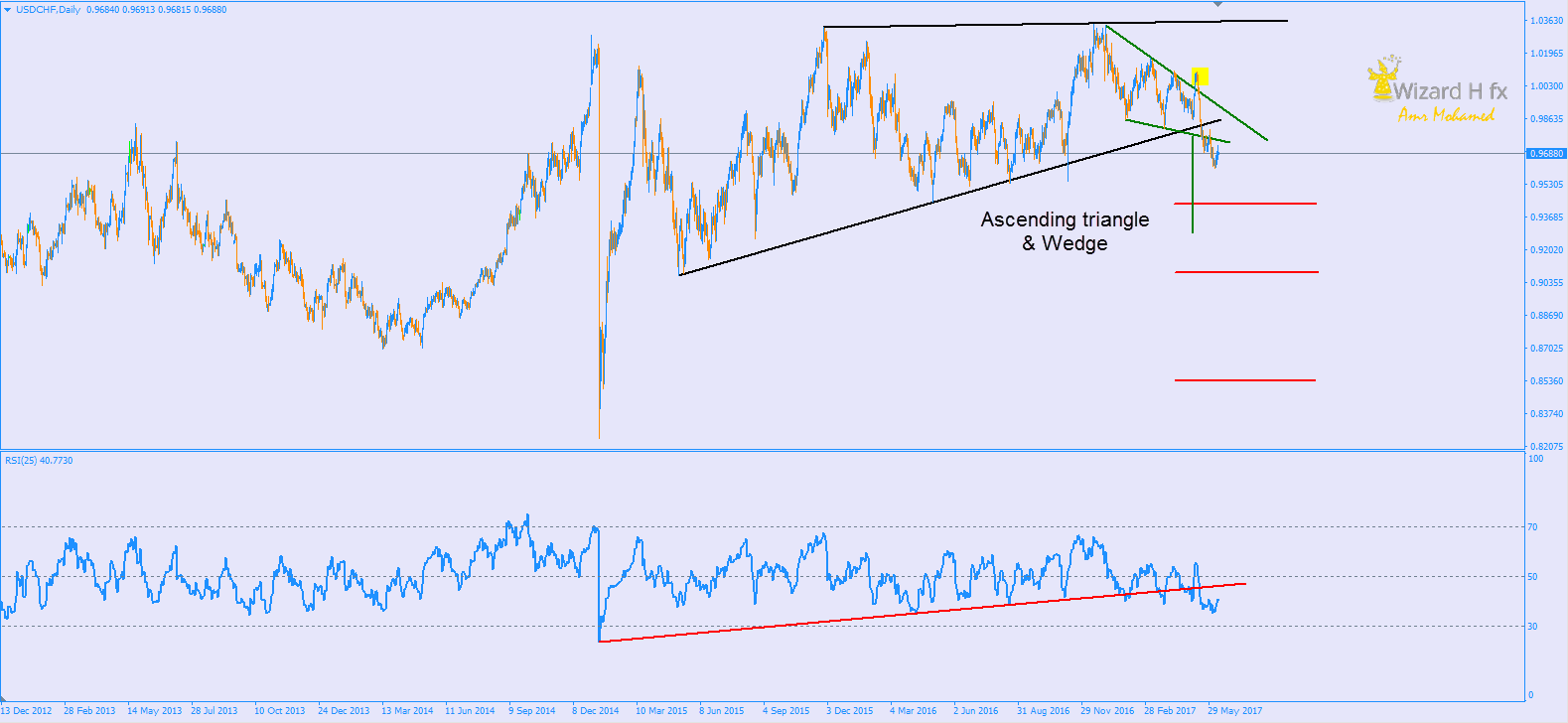 حاليا ، استمر التداول اسفل النموذج عدة جلسات و أعاد الزوج الاختبار و فشل أيضا في العودة مجددا لداخل النموذج ، نظرا لفقدان الدولار القوة و بيع كبار المتاجرين ، أيضا ظهور قلق و التخوف بشأن انتخابات برلمان بريطانيا بالتالي اتجهت القوة الشرائية للفرنك .