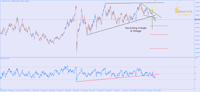 الرسم البياني التالي للزوج علي الاطار الزمني اليومي يوضح ، تكون نموذج مثلث صاعد علي الزوج كون الزوج القاع الاولي عند مستويات 0.9071 ثم ارتد إلي اعلي مكونا قمة عند 1.03 ثم صحح مجددا حتي سجل مستوي قاع عند 0.9443 ، وبعد فترة من الحيرة في الاتجاه و التداول اعلي الضلع السلفي، ارتفع الزوج لمستويات القمة السابقة ، ثم هبط مجددا ليكسر الحدود السفلي للنموذج .