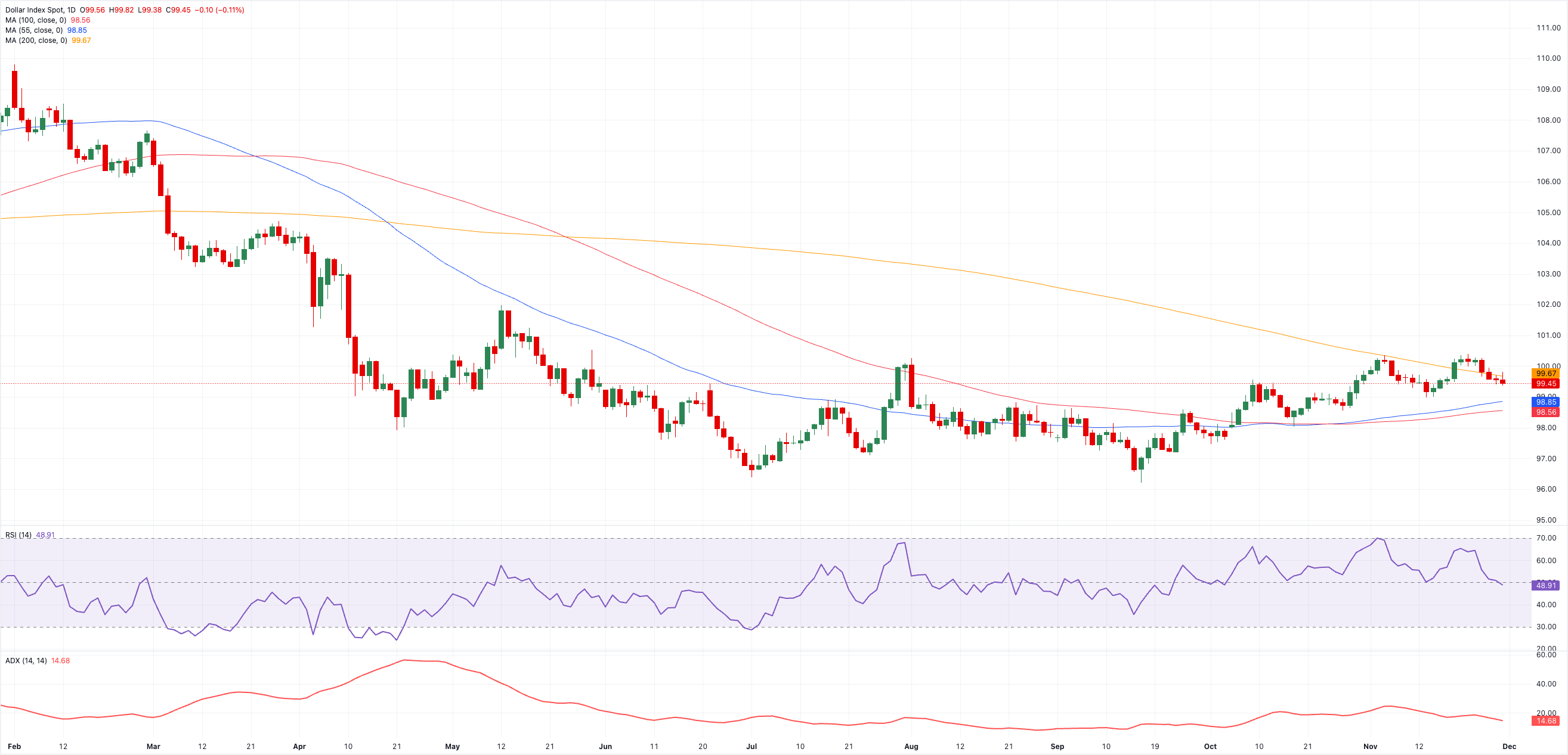 على الجانب الهبوطي، هناك تنافس فوري على أرضية نوفمبر عند 98.99 (13 نوفمبر)، قبل المتوسطات المتحركة البسيطة 55 و100 يوم عند 98.84 و98.54، على التوالي. قد يؤدي فقدان هذه المنطقة إلى إثارة تراجع أعمق إلى القاع الأسبوعي عند 98.03 (17 أكتوبر) قبل أدنى مستوى في 2025 عند 96.21 (17 سبتمبر). يجب أن تستهدف الخسائر الإضافية من هنا وادي فبراير 2022 عند 95.13 (4 فبراير) والقاعدة لعام 2022 عند 94.62 (14 يناير).