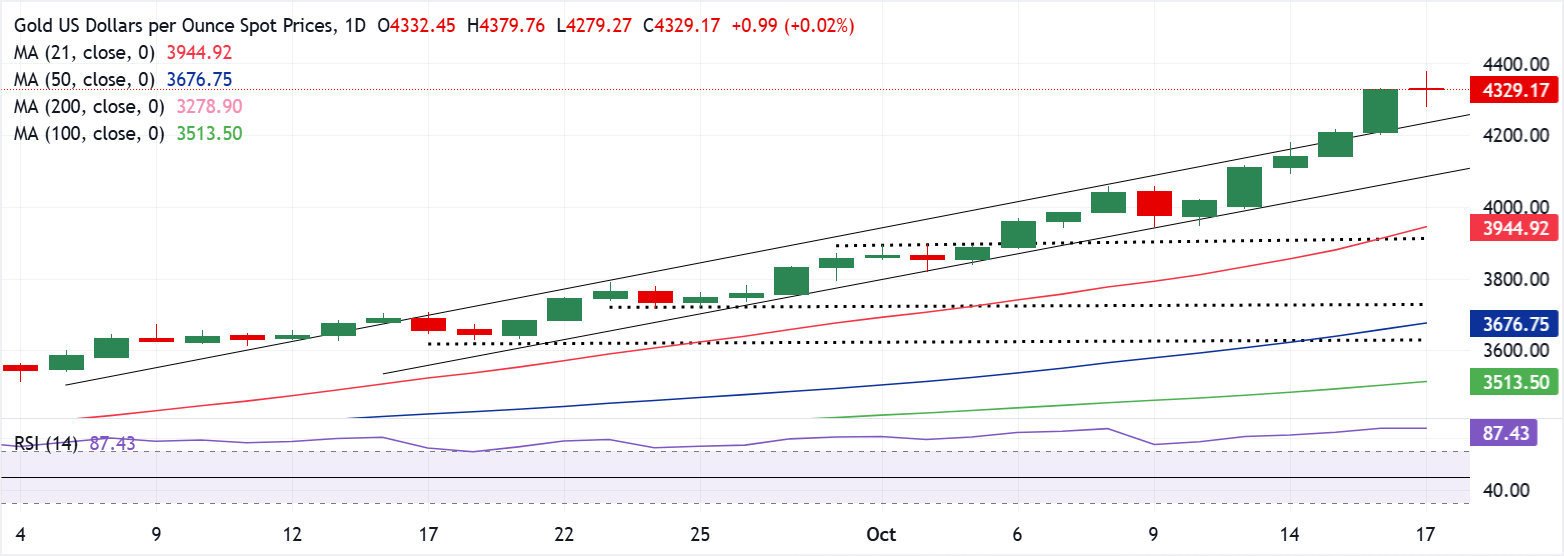 تشهد أسعار الذهب تقلبات شديدة خلال ساعات التداول الآسيوية يوم الجمعة، مدفوعة بموجة من جني الأرباح وتدفقات العزوف عن المخاطرة، بعد الارتفاع البارابولي الأخير إلى قمم قياسية جديدة بالقرب من 4380 دولار.