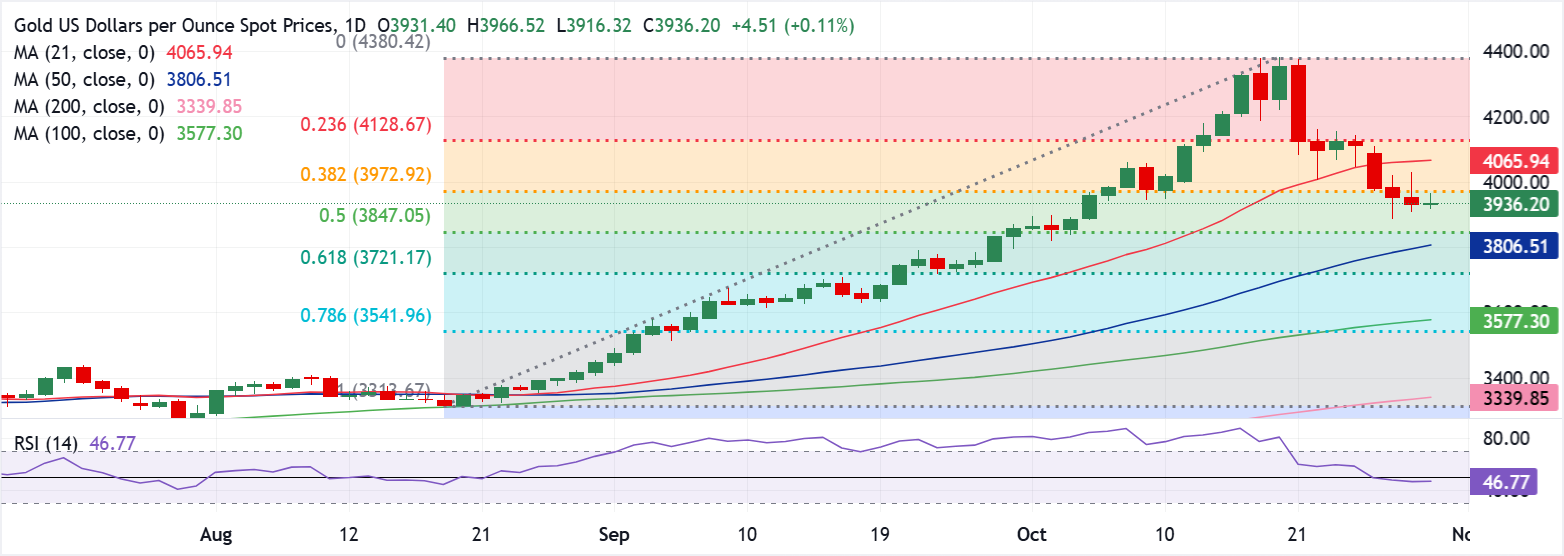 في الرسم البياني اليومي، يتم تداول XAU/USD حاليًا حول 3938 دولار. يتقدم المتوسط المتحرك البسيط 21 صعوديًا فوق المتوسطات الأطول، بما يتماشى مع الزخم الصعودي السائد؛ حيث يقف المتوسط المتحرك البسيط 21 عند 4066 دولار، ويعمل كحاجز أمام الارتفاع الفوري. علاوة على ذلك، فإن المتوسط المتحرك البسيط 50 أيضًا صعودي، ويتقدم أدنى من المتوسط الأقصر؛ حيث يقف المتوسط المتحرك البسيط 50 عند 3807 دولار. تحت السعر الحالي، يوفر المتوسط المتحرك البسيط 50 عند 3807 دولار، والمتوسط المتحرك البسيط 100 عند 3577 دولار، والمتوسط المتحرك البسيط 200 عند 3340 دولار مستويات دعم متتالية، بينما يعمل المتوسط المتحرك البسيط 21 عند 4066 دولار كمقاومة. انخفض مؤشر القوة النسبية (14) إلى 47، متجاوزًا خطه الوسيط المحايد 50 بعد قراءات سابقة في منطقة ذروة الشراء الشديدة؛ حيث يقلل الارتفاع الأخير من 46 من الزخم الهبوطي ويفضل التماسك حيث تظل الهيكلية الأوسع للمتوسطات المتحركة إيجابية.