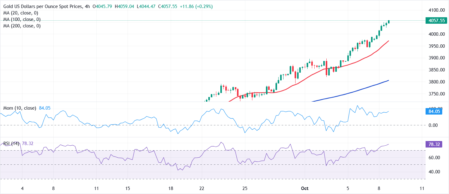 يواصل زوج الذهب/الدولار XAU/USD الارتفاع في فترة ما بعد الظهيرة الأمريكية، حيث يتداول حاليًا قرب 4055 دولار. تستمر ظروف التشبع الشرائي الشديدة في الرسم البياني اليومي، ولكن أيضًا الزخم الصعودي القوي. تسارعت المؤشرات الفنية في تقدمها، حيث يتجه مؤشر الزخم شمالًا بشكل عمودي تقريبًا ويتقدم مؤشر القوة النسبية (RSI) إلى ما فوق 87. في الوقت نفسه، يتجاوز الذهب جميع المتوسطات المتحركة الصعودية، مع أقربها هو المتوسط المتحرك البسيط 20 (SMA) عند حوالي 3785 دولار.