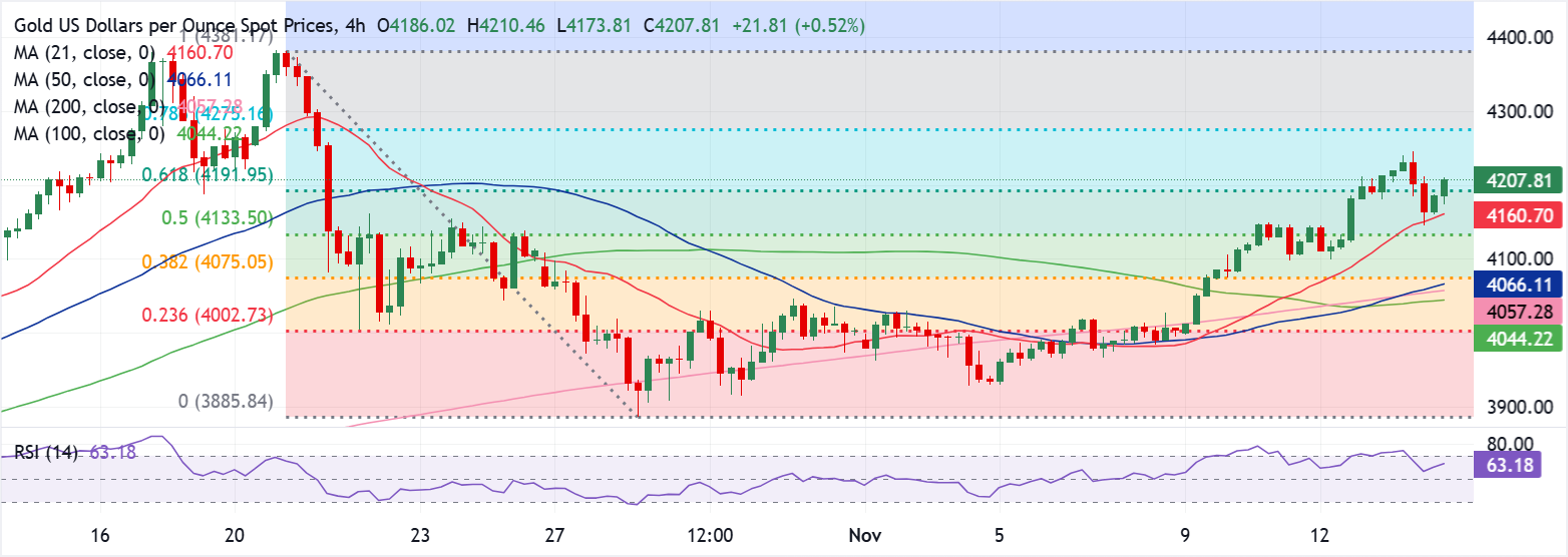 عاد الذهب إلى المنطقة الإيجابية، محاولًا مرة أخرى الوصول إلى مستوى 4200 دولار في وقت مبكر من يوم الجمعة، مما يعكس جزئيًا تراجع يوم الخميس من أعلى مستويات الثلاثة أسابيع عند 4245 دولار.
