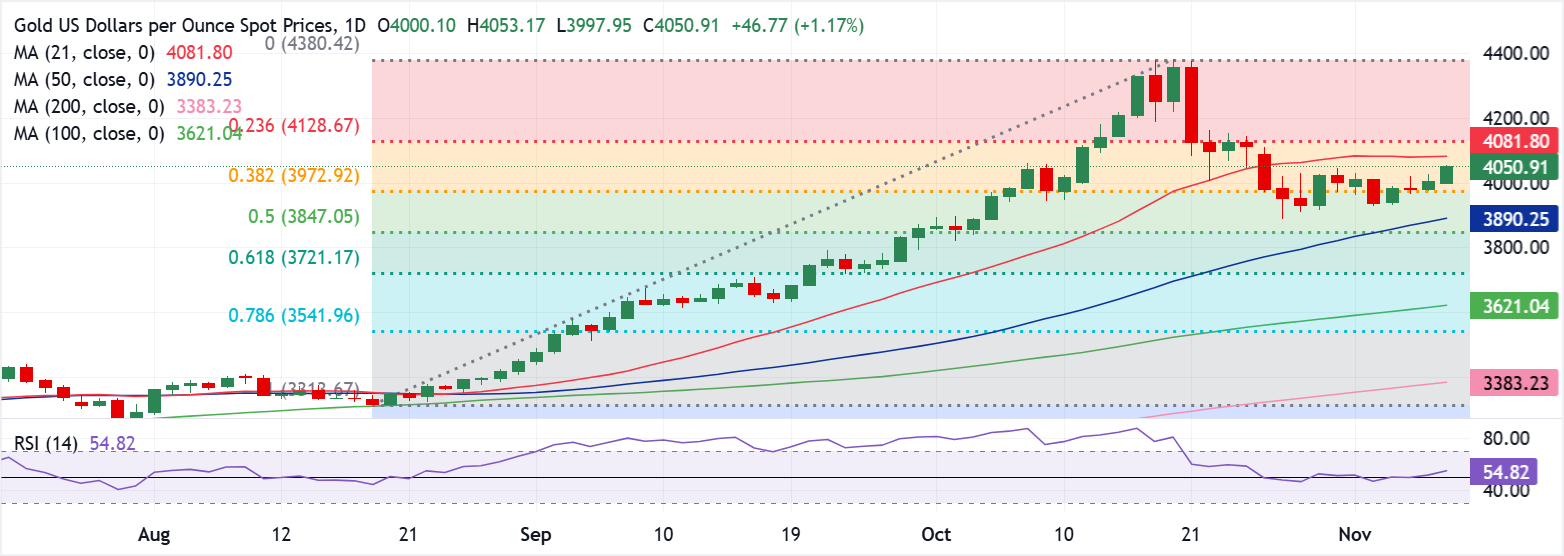 يبحث الذهب الآن عن القبول فوق المستوى النفسي 4050 دولار لمواجهة المتوسط المتحرك البسيط 21 يومًا عند 4081 دولار.