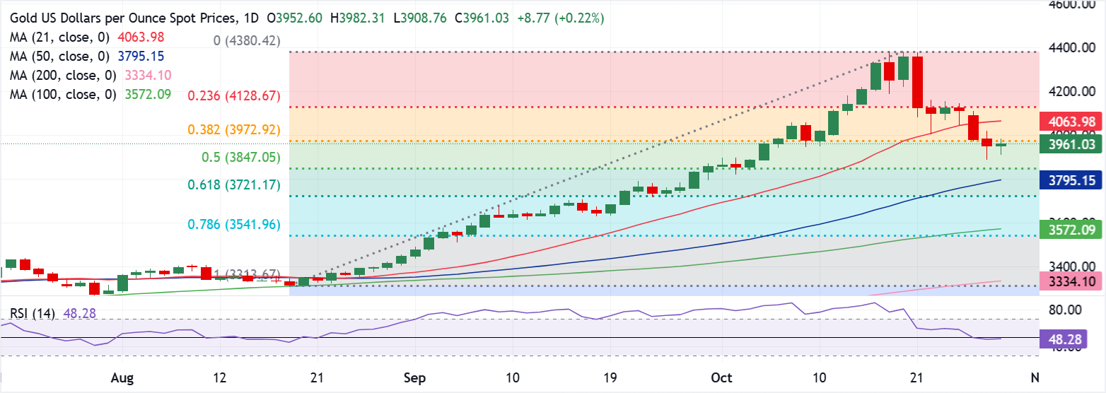 يظهر الرسم البياني اليومي أن أسعار الذهب قد حافظت على ارتدادها من قرب الدعم الحرج عند 3847 دولار، وهو مستوى فيبوناتشي 50% للتصحيح من الارتفاع البارابولي الذي بدأ في منتصف أغسطس.