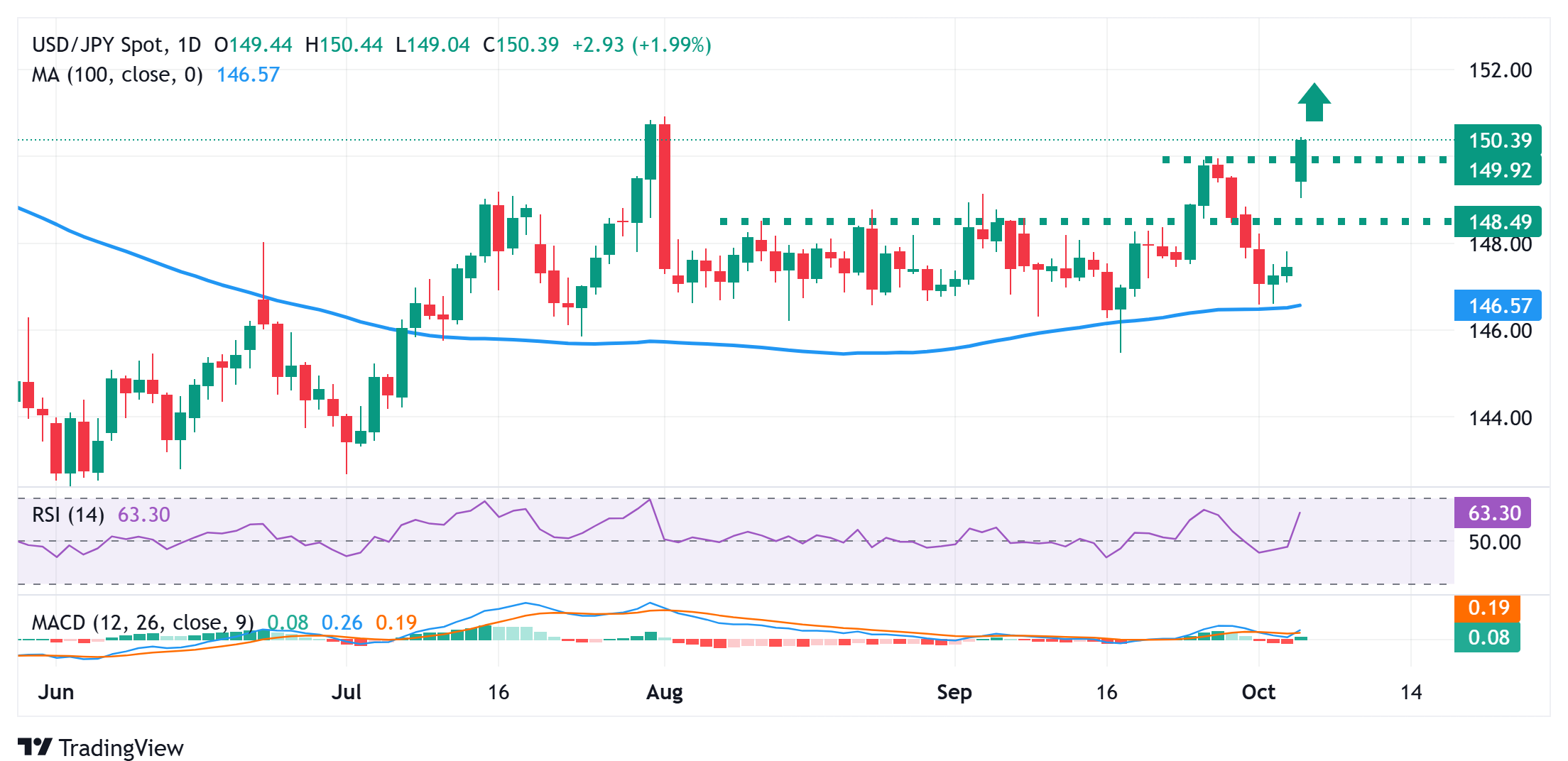 افتتح زوج الدولار الأمريكي/الين الياباني USD/JPY بفجوة صعودية في بداية أسبوع جديد وارتفع متجاوزًا الحاجز النفسي 150.00، ليصل إلى أعلى مستوى له منذ أوائل أغسطس ردًا على نتيجة غير متوقعة في مسابقة القيادة في اليابان. فازت سناي تاكايشي بانتخابات قيادة الحزب الليبرالي الديمقراطي يوم السبت ومن المتوقع الآن أن يتم تأكيدها كأول رئيسة وزراء في اليابان خلال جلسة برلمانية في منتصف أكتوبر. تُعتبر تاكايشي حمامة مالية وبرزت في السباق كالداعمة الوحيدة للإنفاق الكبير. تحدد النتيجة مسار البلاد نحو سياسة مالية توسعية أكثر، مما قد يعقد مهمة بنك اليابان (BoJ) ويكون عاملًا رئيسيًا يضغط بشدة على الين الياباني.