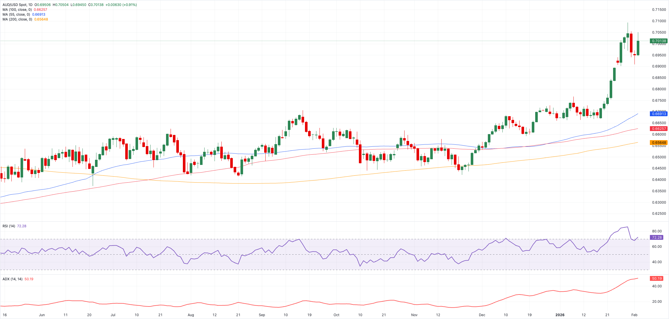 الحد الأعلى التالي لزوج الدولار الأسترالي/الدولار الأمريكي يأتي عند سقف 2026 عند 0.7093 (29 يناير)، قبل القمة لعام 2023 عند 0.7157 (2 فبراير).