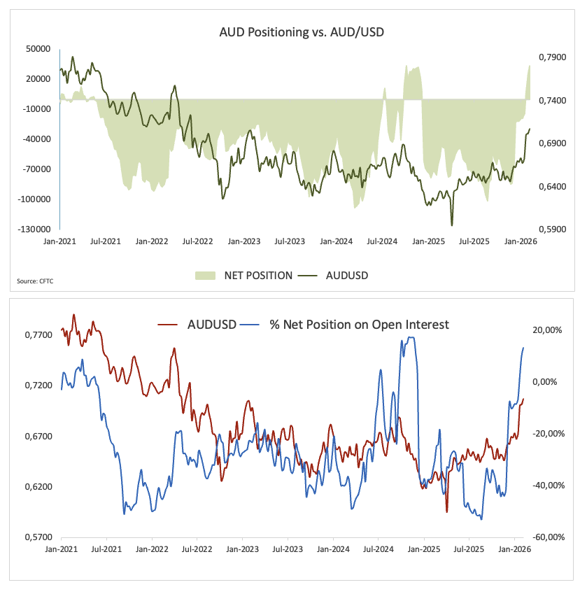هناك شعور واضح بأن المستثمرين يعيدون دخولهم إلى الدولار الأسترالي. تتجه المراكز نحو التحسن، ويبدو أن الحالة أكثر إيجابية، لكن هذه ليست تجارة مزدحمة في اتجاه واحد. يبدو أنها إعادة بناء ثابتة للثقة بدلاً من انفجار من الحماس.