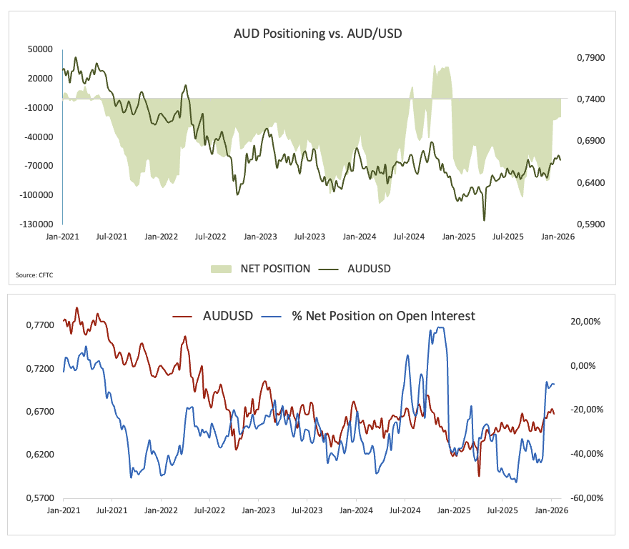 تشير بيانات تحديد مراكز التداول إلى أن أسوأ ما في الاتجاه الهبوطي قد يكون انتهى، لكن القناعة لا تزال ضعيفة. أظهرت أرقام لجنة تداول السلع الآجلة (CFTC) للأسبوع المنتهي في 13 يناير/كانون الثاني أن صافي المراكز القصيرة المضاربية في الدولار الأسترالي قد انخفضت قليلاً، حيث تظل قريبة من 19 ألف عقد، وهو أقل موقف هبوطي منذ سبتمبر/أيلول 2024.