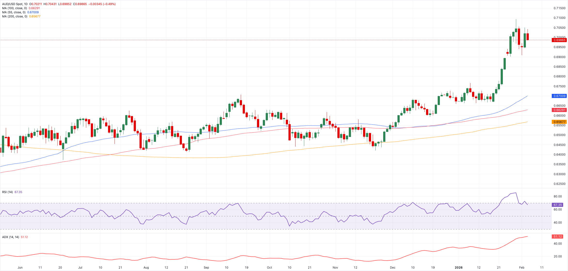 في الوقت الحالي، يبقي الدولار الأمريكي الأضعف، والبيانات المحلية الثابتة، إن لم تكن مثيرة، وبنك الاحتياطي الأسترالي الذي لا يزال يميل نحو التشديد، والدعم المتواضع من الصين، الميل نحو مزيد من الارتفاع بدلاً من انعكاس أعمق.
