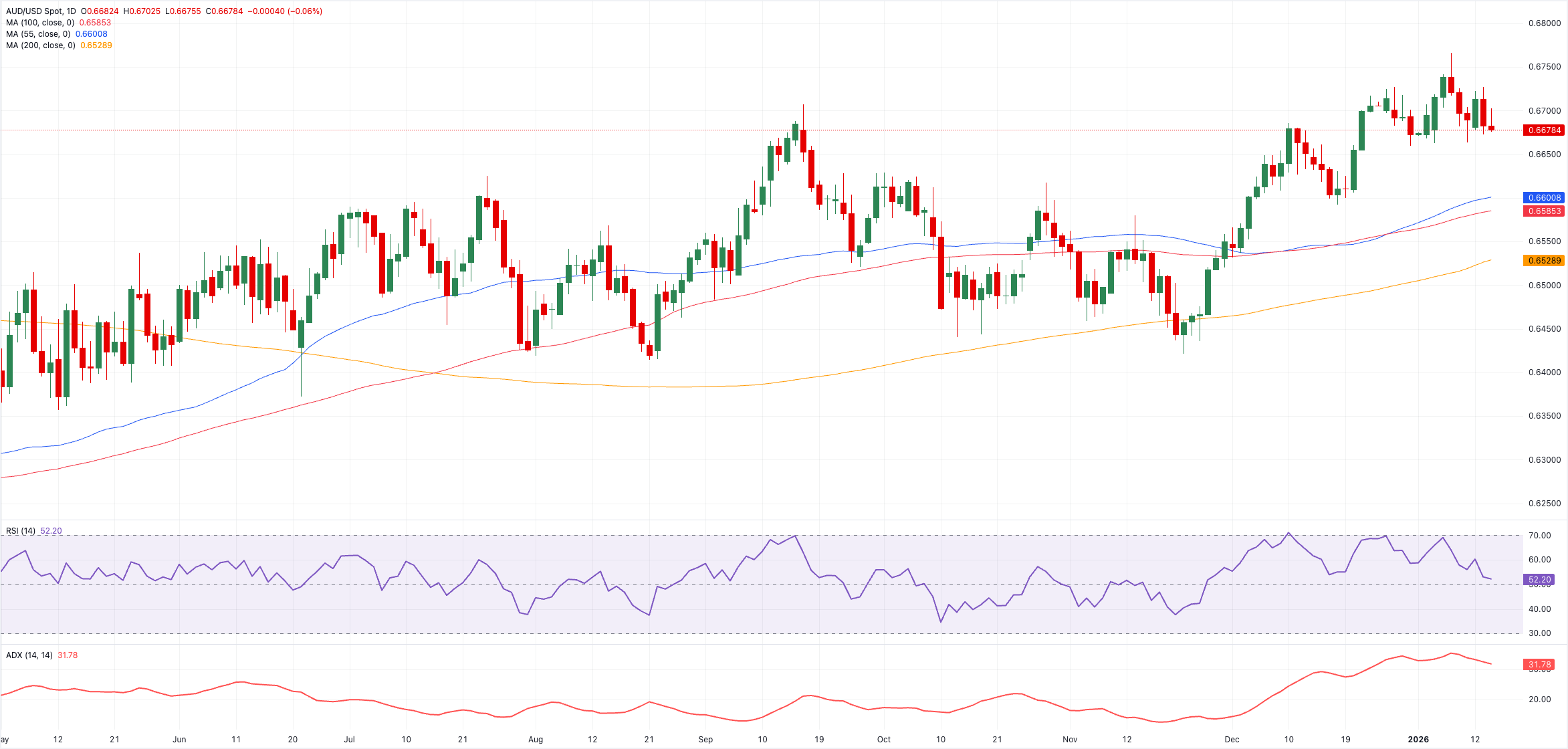 في الوقت نفسه، لا يزال السياق الأوسع للزوج يبدو إيجابيًا. يستقر الزوج فوق كل من المتوسطين المتحركين البسيطين لمدة 200 أسبوع و200 يوم، عند 0.6624 و0.6521 على التوالي. يبقي هذا على التحيز متوسط الأجل مائلًا نحو الارتفاع ويشير إلى أن التراجع الأخير يبدو أكثر كضجيج من كونه تغييرًا حقيقيًا في الاتجاه.