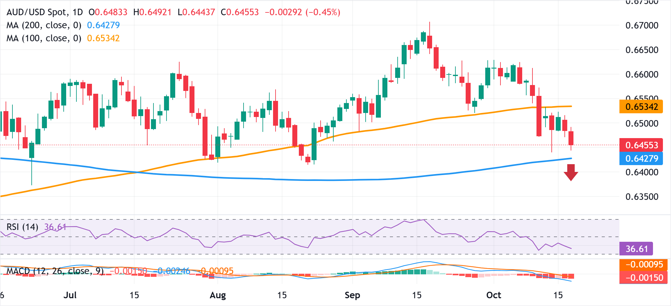 في الواقع، وصل مؤشر الدولار الأمريكي (DXY)، الذي يتتبع العملة الأمريكية مقابل سلة من العملات، إلى أدنى مستوى له في أسبوع ونصف وسط رهانات على خفض أسعار الفائدة مرتين أخريين من قبل الاحتياطي الفيدرالي الأمريكي هذا العام. بخلاف ذلك، فإن المخاطر الاقتصادية الناجمة عن إغلاق الحكومة الأمريكية لفترة طويلة تضغط أيضًا على الدولار الأمريكي. فشلت التصويت على مشروع قانون التمويل المؤقت المدعوم من الجمهوريين لإعادة فتح الحكومة في الحصول على الأصوات اللازمة للمرور في مجلس الشيوخ للمرة العاشرة يوم الخميس، مما يبرز حالة الجمود في الكونغرس. هذا، بدوره، يسحب الدولار الأمريكي للأسفل لليوم الرابع على التوالي. ومع ذلك، يكافح زوج الدولار الأسترالي/الدولار الأمريكي لجذب أي مشترين، مما يشير إلى أن مسار المقاومة الأقل للأسعار الفورية هو نحو الأسفل.