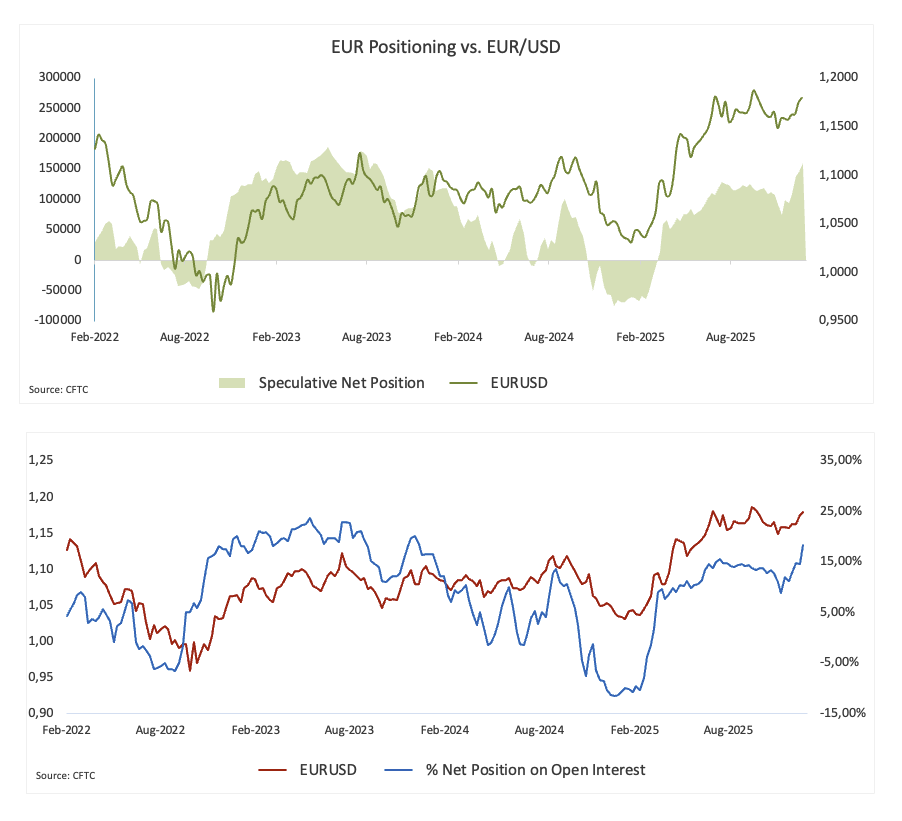 تعزز الطلب غير التجاري على اليورو (EUR). أظهرت بيانات لجنة تداول السلع الآجلة (CFTC) للأسبوع المنتهي في 23 ديسمبر أن صافي المراكز الطويلة قد زاد إلى مستويات لم تُرَ منذ صيف 2023 قرب 160 ألف عقد. في الوقت نفسه، زادت الحسابات المؤسسية أيضًا من تعرضها، مع ارتفاع صافي المراكز القصيرة إلى أكثر من أعلى مستوى له في عامين قرب 209.5 ألف عقد.