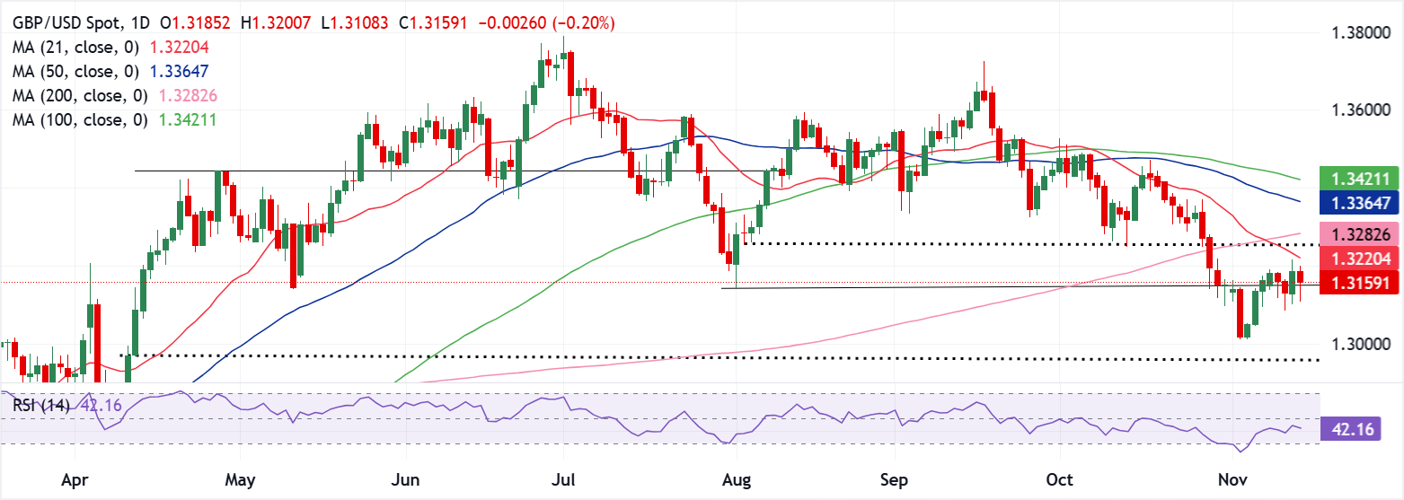 كما لوحظ في الرسم البياني اليومي، توقف زوج استرليني/دولار GBP/USD عن انتعاشه من أدنى مستوياته في سبعة أشهر عند 1.3010، أسفل المتوسط المتحرك البسيط لمدة 21 يومًا المنحدر للأسفل عند 1.3220.