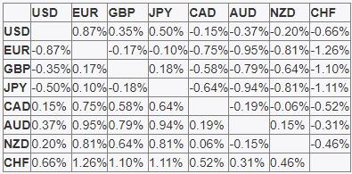 تُظهر الخريطة الحرارية النسبة المئوية للتغيرات في العملات الرئيسية في مقابل بعضها البعض. يتم اختيار العملة الأساسية من العمود الأيسر، بينما يتم اختيار العملة المقابلة من الصف العلوي. على سبيل المثال، إذا اخترت اليورو من العمود الأيسر وتحركت على طول الخط الأفقي إلى الدولار الأمريكي، فإن النسبة المئوية للتغير المعروضة في المربع سوف تمثل اليورو EUR (الأساس)/الدولار الأمريكي USD (التيسير).
