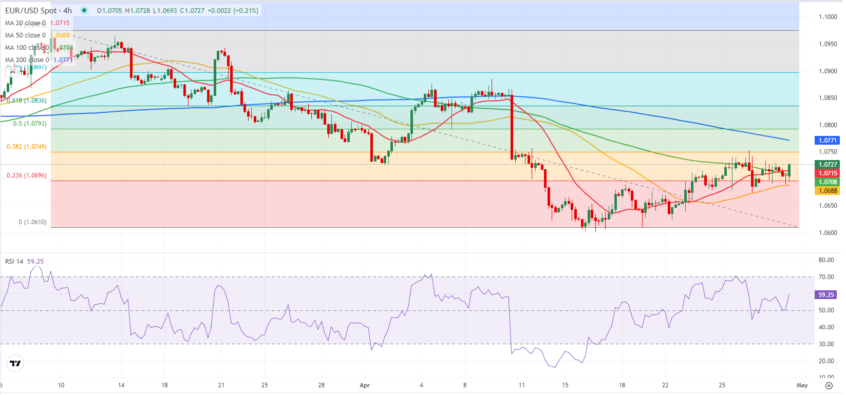 ارتفع مؤشر القوة النسبية RSI على الرسم البياني لإطار 4 ساعات إلى مستويات 60 بعد اختبار مستويات 50 في وقت سابق من اليوم، مما يسلط الضوء على تردد البائعين. بالنسبة للاتجاه الصاعد، تظهر منطقة 1.0750 (مستويات تصحيح فيبوناتشي 38.2% من الاتجاه الهابط الأخير) بمثابة منطقة المقاومة الأولى قبل منطقة 1.0770 (المتوسط المتحرك البسيط 200 فترة) ومنطقة 1.0800 (مستوى نفسي).