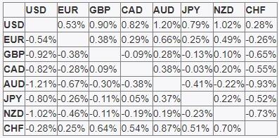 يوضح الجدول أدناه النسبة المئوية للتغير في اليورو EUR في مقابل العملات الرئيسية المدرجة هذا الأسبوع. كان اليورو هو الأضعف في مقابل الدولار الأمريكي.