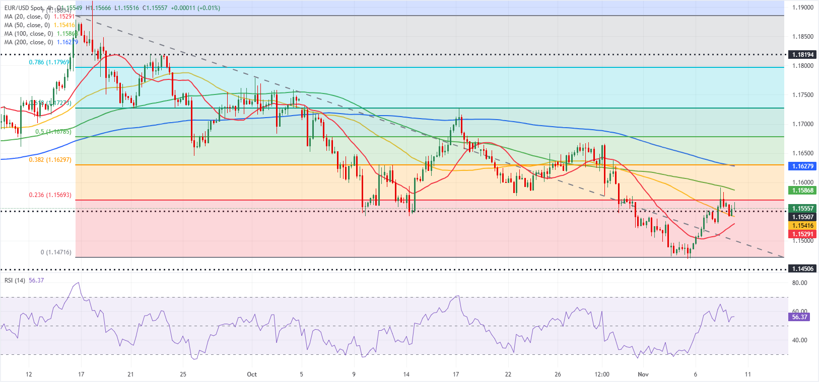 (تم تصحيح هذه القصة في 10 نوفمبر الساعة 08:34 بتوقيت غرينتش للإشارة إلى أن زوج يورو/دولار EUR/USD يتداول حول 1.1550 في صباح التعاملات الأوروبية يوم الاثنين، وليس يوم الجمعة.)