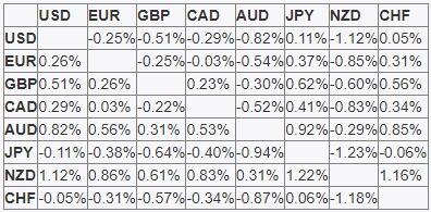 يوضح الجدول أدناه النسبة المئوية للتغير في اليورو EUR في مقابل العملات الرئيسية المدرجة هذا الأسبوع. كان اليورو هو الأقوى في مقابل الين الياباني.