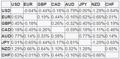 تُظهر الخريطة الحرارية التغيرات المئوية للعملات الرئيسية في مقابل بعضها البعض. يتم اختيار العملة الأساسية من العمود الأيسر، بينما يتم اختيار عملة التسعير من الصف العلوي. على سبيل المثال، إذا اخترت اليورو من العمود الأيسر وتحركت على طول الخط الأفقي إلى الين الياباني، فإن النسبة المئوية للتغير المعروض في المربع سوف تمثل زوج يورو EUR (الأساس) / ين JPY (التسعير).