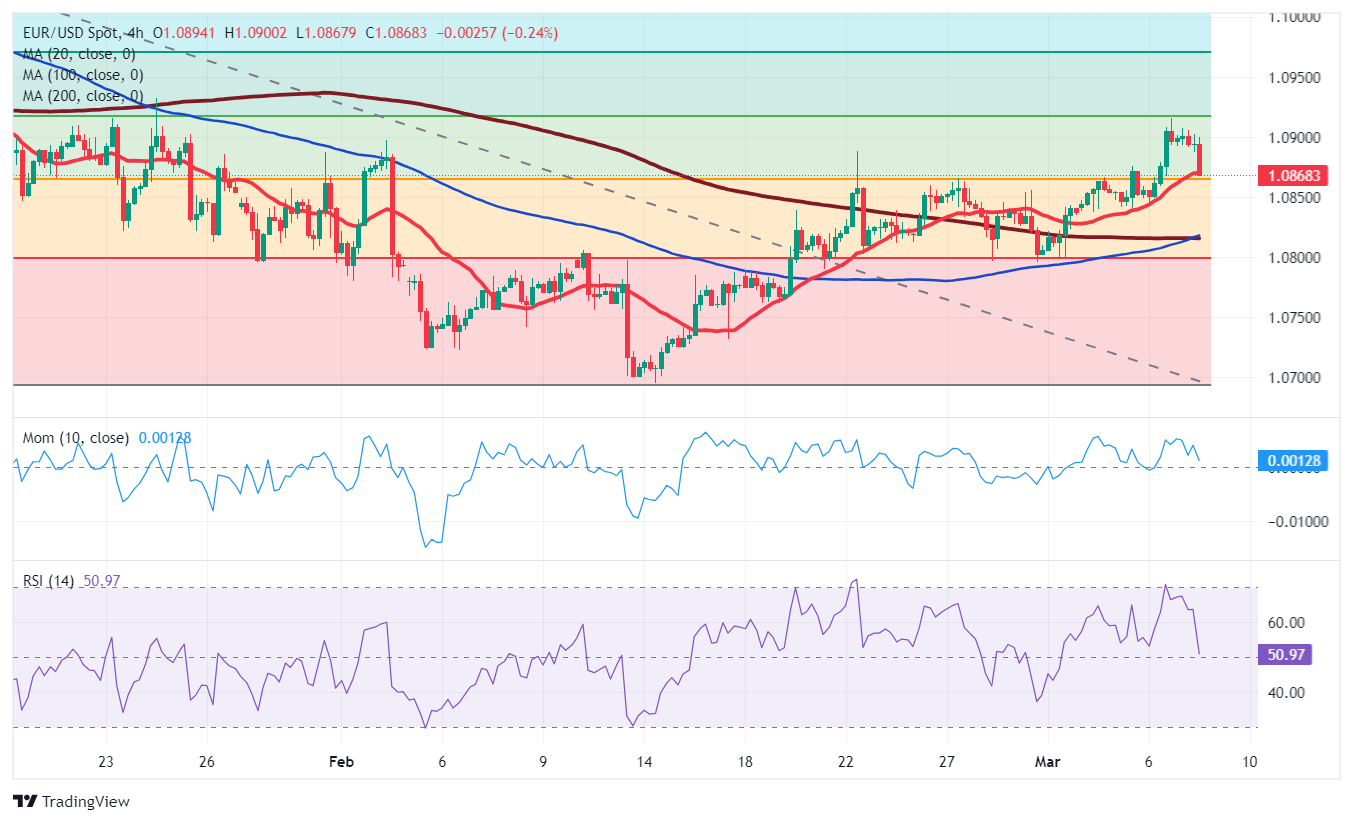 بلغ زوج يورو/دولار EUR/USD قمة عند 1.0915 يوم الأربعاء، وهو أعلى مستوى حققه في ستة أسابيع، حيث فقد الدولار الأمريكي قوته بعد تعليقات رئيس مجلس الاحتياطي الفيدرالي جيروم باول. أدلى باول بشهادته حول تقرير السياسة النقدية نصف السنوي أمام لجنة الخدمات المالية في مجلس النواب بشأن السياسة النقدية. وكرر إلى حد كبير الرسالة المعروفة المتمثلة في الحفاظ على أسعار الفائدة مرتفعة لفترة أطول، مضيفًا أن القرارات المستقبلية ستعتمد على البيانات. كما أكد مجددًا أن سعر الفائدة الأساسي من المرجح أن يكون قد وصل إلى ذروته وأن صناع السياسة اعتبروا أنه من المناسب خفض معدلات السياسة النقدية "في مرحلة ما من هذا العام". ومن المقرر أن يدلي الرئيس باول بشهادته مرة أخرى يوم الخميس، وإن كان أمام لجنة مختلفة.