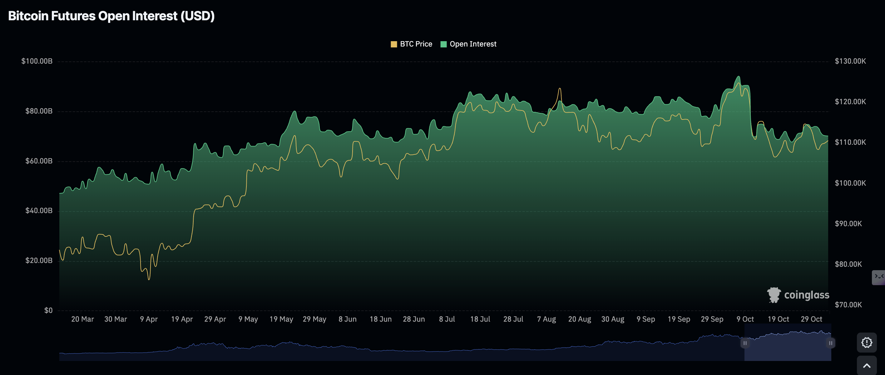 وبالمثل، لا يزال الاهتمام من الأفراد مضغوطًا وسط ضعف سوق المشتقات. وفقًا لبيانات كوين جلاس CoinGlass، يبلغ متوسط الفائدة المفتوحة للبيتكوين (OI)، التي تتعقب القيمة الاسمية لعقود الآجلة المعلقة، حوالي 70 مليار دولار في وقت كتابة هذا التقرير، بانخفاض من 94 مليار دولار، وهو المستوى الأقصى في أكتوبر/تشرين الأول.