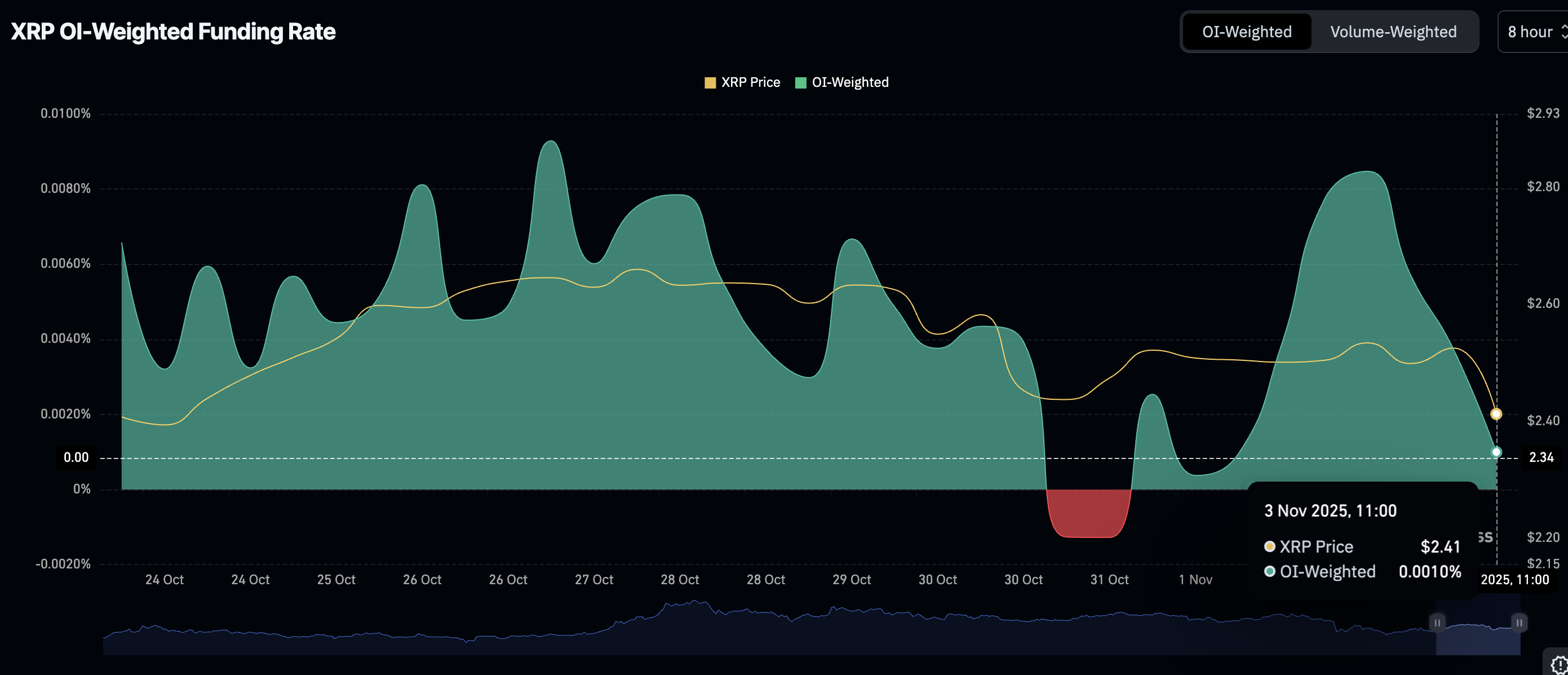 تظهر بيانات كوين جلاس CoinGlass أن نسبة التمويل الموزونة حسب الفائدة المفتوحة تبلغ 0.0010%، بانخفاض من 0.0085% يوم الأحد. يشير هذا الانخفاض إلى أن المتداولين قد يغلقون عمدًا مراكزهم الطويلة ويتجهون نحو المراكز القصيرة، مما يحرم الريبل من الزخم اللازم للحفاظ على تعافيها.