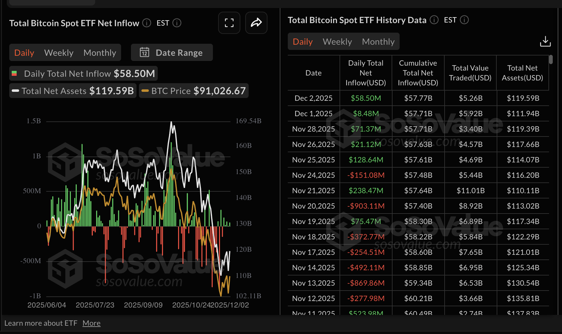 سجلت صناديق الاستثمار المتداولة الفورية (ETFs) للبيتكوين يومها الخامس على التوالي من التدفقات الداخلية يوم الثلاثاء. تظهر بيانات SoSoValue أن صناديق البيتكوين المتداولة المدرجة في الولايات المتحدة سجلت ما يقرب من 59 مليون دولار من التدفقات الداخلية، مما رفع إجمالي حجم التدفقات الداخلية التراكمي إلى حوالي 58 مليار دولار، مع متوسط صافي الأصول يبلغ 120 مليار دولار.
