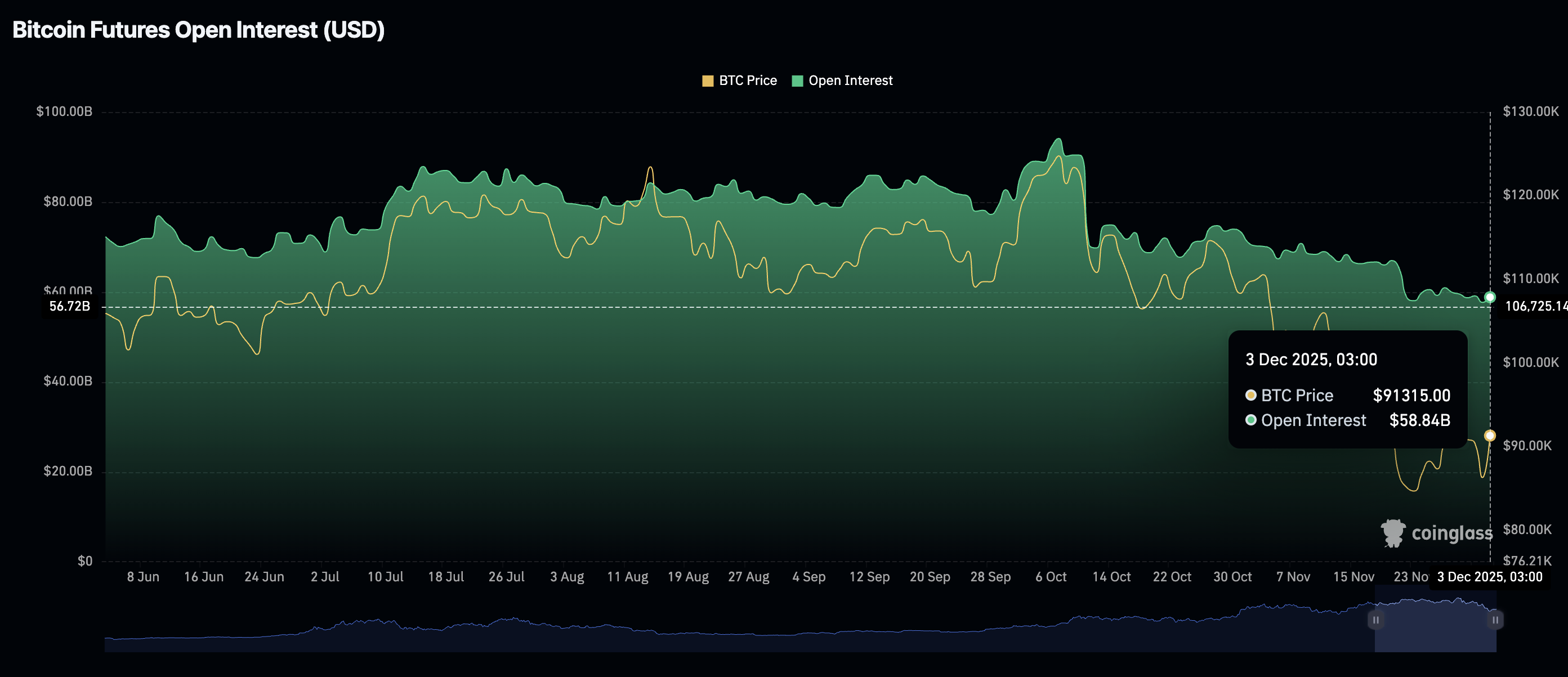 على الرغم من التدفقات الداخلية المعتدلة ولكن المستمرة للصناديق المتداولة، لا يزال اهتمام التجزئة بعملة البيتكوين تحت الضغط بشكل كبير. تظهر بيانات CoinGlass أن الفائدة المفتوحة (OI) لعقود البيتكوين الآجلة بلغت 59 مليار دولار يوم الأربعاء، بانخفاض قدره 34% من حوالي 90 مليار دولار في 10 أكتوبر/تشرين الأول. إن الزيادة المستمرة في مقاييس الفائدة المفتوحة تعكس اهتمام وثقة التجزئة، والتي تلعب دورًا رئيسيًا في دعم زيادات الأسعار.