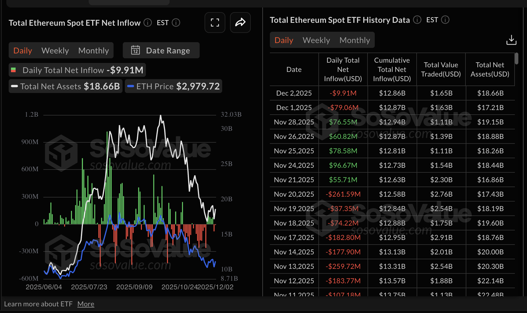 تراجع الطلب المؤسسي على الإيثريوم يوم الاثنين، حيث شهدت صناديق الاستثمار المتداولة المدرجة في الولايات المتحدة 79 مليون دولار من التدفقات الخارجية. استمر الاتجاه الهبوطي يوم الثلاثاء، كما يتضح من تدفقات خارجية تقارب 10 ملايين دولار. يبلغ إجمالي التدفقات الداخلية الصافية التراكمية 12.86 مليار دولار مع صافي أصول يبلغ 18.66 مليار دولار.