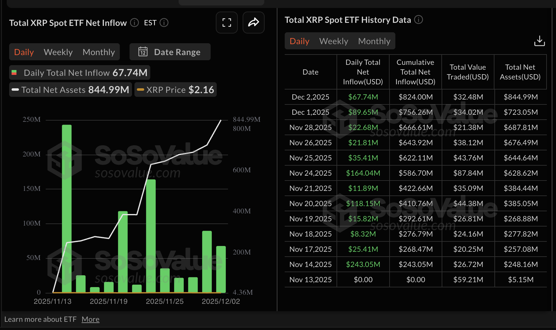 من ناحية أخرى، تستمر الريبل في تسجيل تدفقات داخلية مستقرة لصناديق الاستثمار المتداولة ETF، مما يشير إلى تحول محتمل في اهتمام المستثمرين نحو منتجات الاستثمار القائمة على العملات البديلة. كما هو موضح في الرسم البياني أدناه، سجلت صناديق الريبل المدرجة في الولايات المتحدة ما يقرب من 68 مليون دولار من التدفقات الداخلية يوم الثلاثاء، مما يمدد سلسلة صعودية استمرت 12 يومًا. حتى الآن، تمتلك صناديق الريبل 824 مليون دولار من التدفقات الداخلية التراكمية، مع صافي أصول يبلغ 845 مليون دولار.