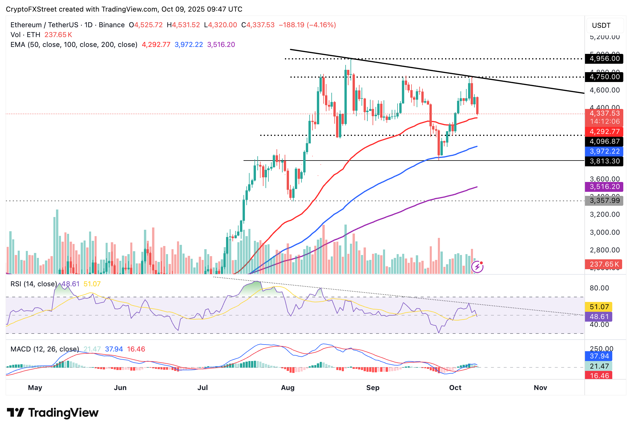 يترقب ثيران الإيثريوم انتعاشًا محتملاً حيث يقترب رمز العقود الذكية من دعم المتوسط المتحرك الأسي لمدة 50 يومًا عند 4,292 دولار. يعزز مؤشر القوة النسبية المتراجع عند 48 القبضة الهبوطية على المدى القصير.