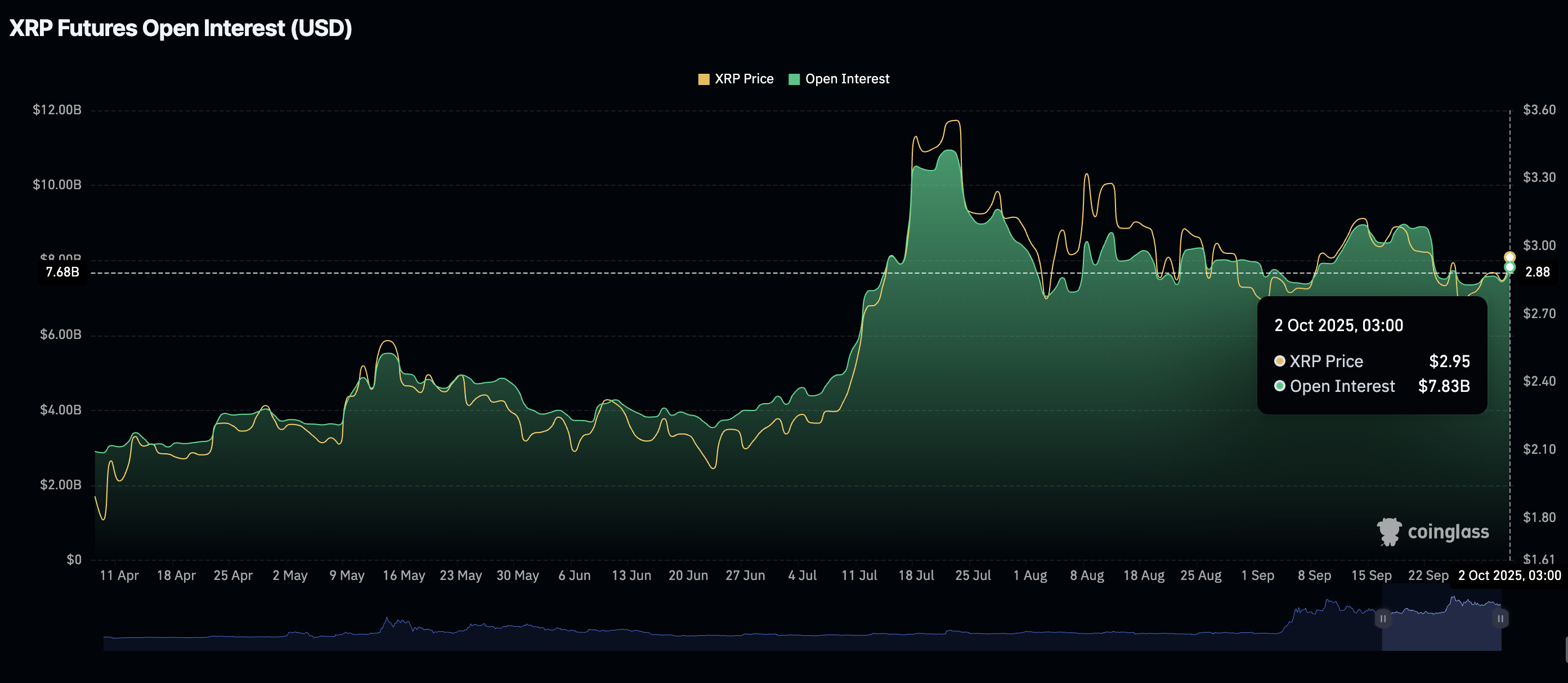 في هذه الأثناء، يرتفع الطلب من التجزئة على مشتقات XRP أيضًا، مع وصول الفائدة المفتوحة للعقود الآجلة (OI) إلى أدنى مستوى شهري قدره 7.35 مليار دولار لتتوسط حوالي 7.83 مليار دولار في وقت كتابة هذا التقرير، وفقًا لـ CoinGlass.