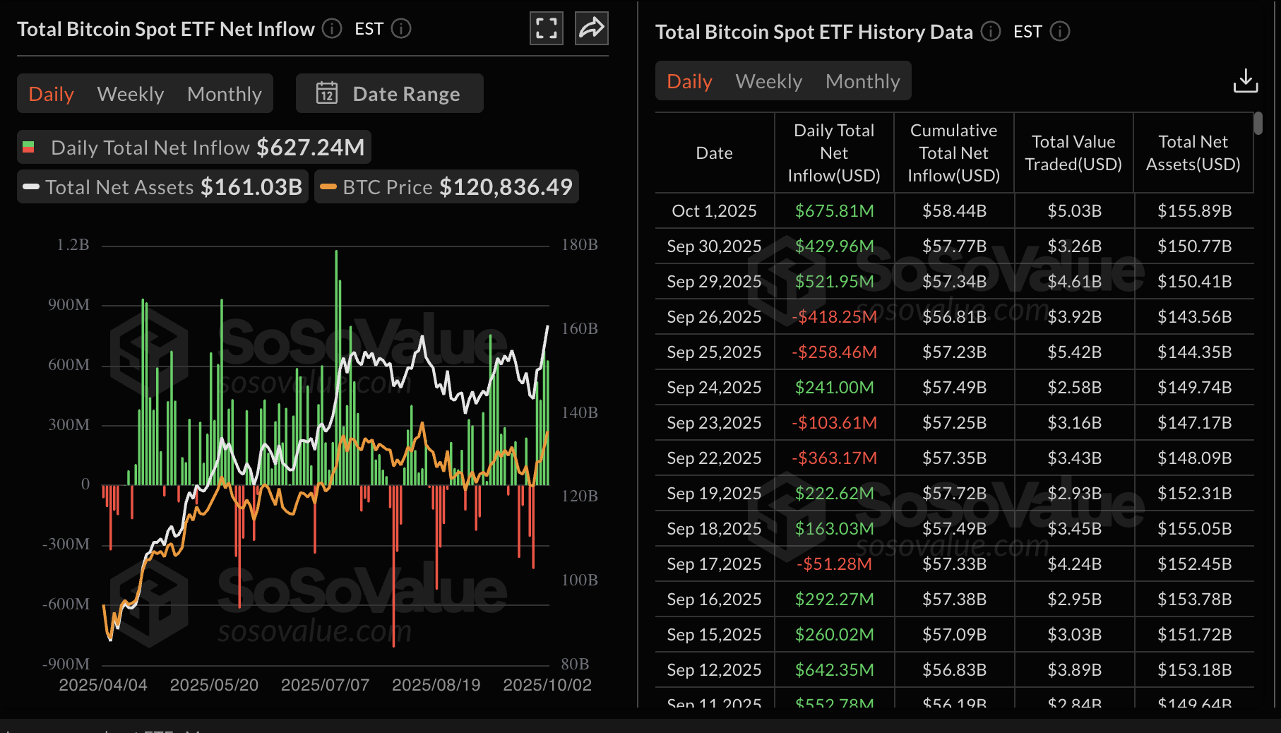 تحسن الاهتمام بمنتجات بيتكوين الفورية المتداولة (ETF) بشكل كبير منذ بداية الأسبوع، والذي أظهرته التدفقات الداخلية المستقرة. تظهر بيانات SoSoValue أن صناديق الاستثمار المتداولة الأمريكية شهدت تدفقات داخلية إجمالية بلغت 627 مليون دولار يوم الخميس، و676 مليون دولار يوم الأربعاء، و430 مليون دولار يوم الثلاثاء و522 مليون دولار يوم الاثنين.