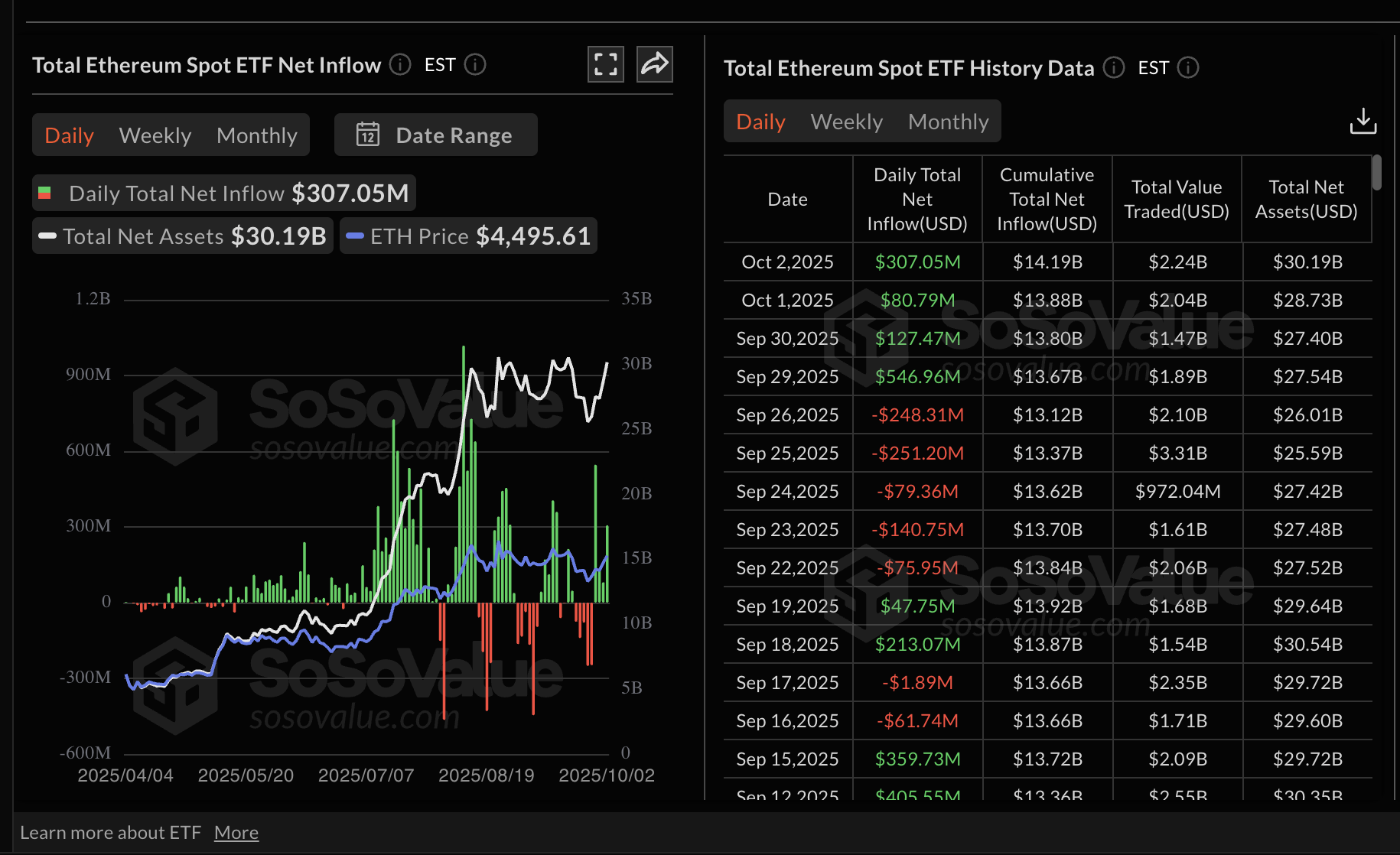 كما زاد الطلب على صناديق الإيثريوم الفورية المتداولة هذا الأسبوع بشكل مستمر، لكنه تخلف بشكل كبير عن الطلب على بيتكوين. بلغت التدفقات الداخلية يوم الخميس 307 مليون دولار، مما يمثل أربعة أيام متتالية من التدفقات الداخلية.