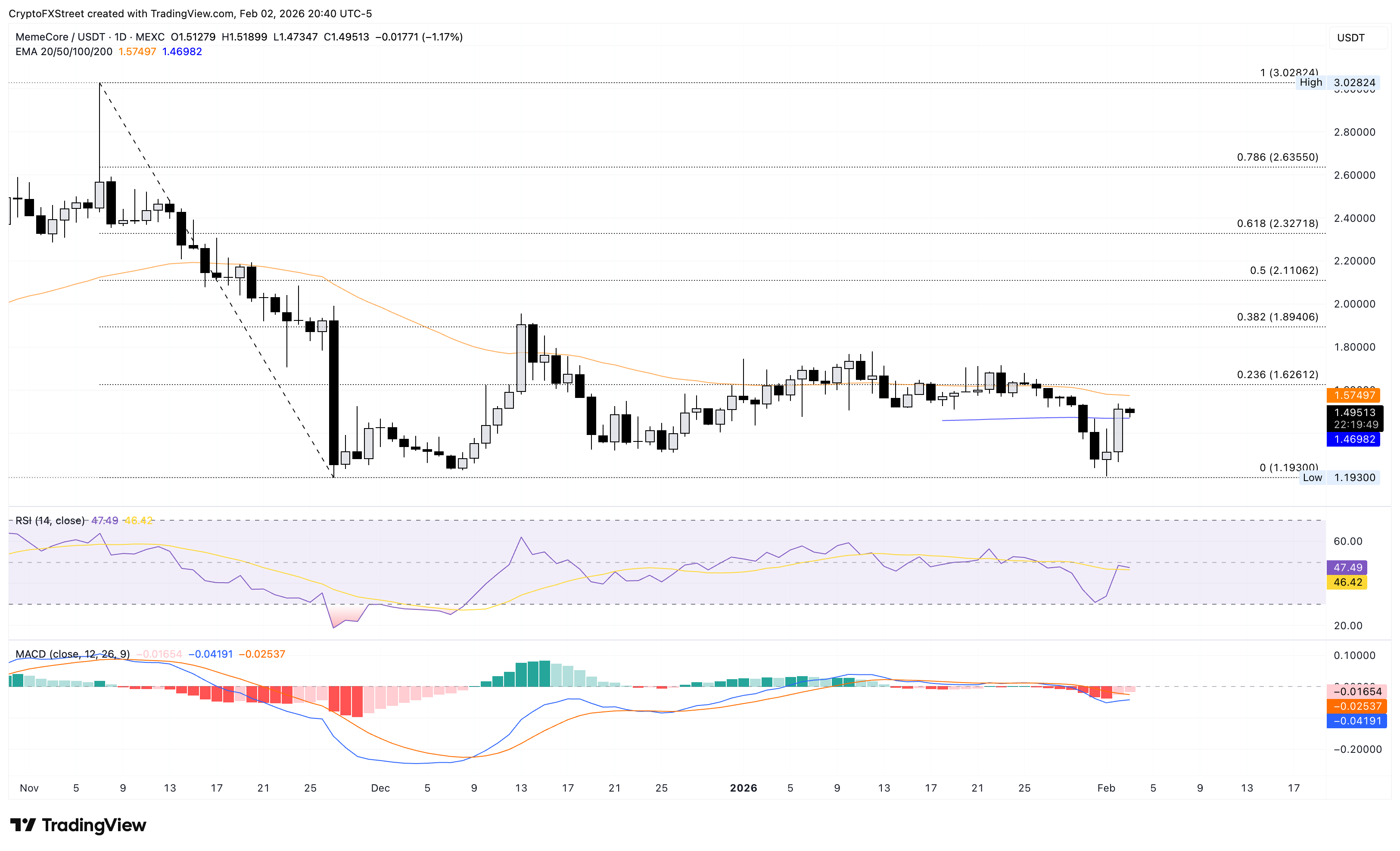- ميمكور (MemeCore) يأخذ استراحة، مستقرًا فوق المتوسط المتحرك الأسي لمدة 200 يوم بعد ارتفاع بنسبة %15 يوم الاثنين.
