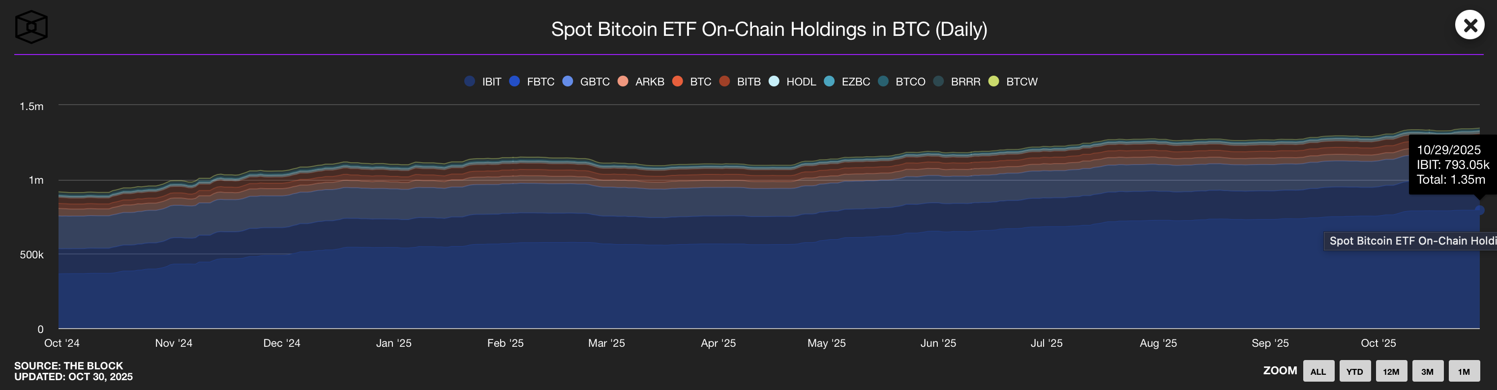 بعد سنوات من الصراع القانوني ومبادرة بلاك روك، تم إدراج 12 صندوق استثماري مرتبط بالبيتكوين ETFs في يناير 2024. وقد وفر هذا تدفقًا مؤسسيًا إلى البيتكوين، الذي، اعتبارًا من 30 أكتوبر، يحتفظ بـ 1.35 مليون بيتكوين أو ما يقرب من 6.5% من إجمالي عرض البيتكوين.