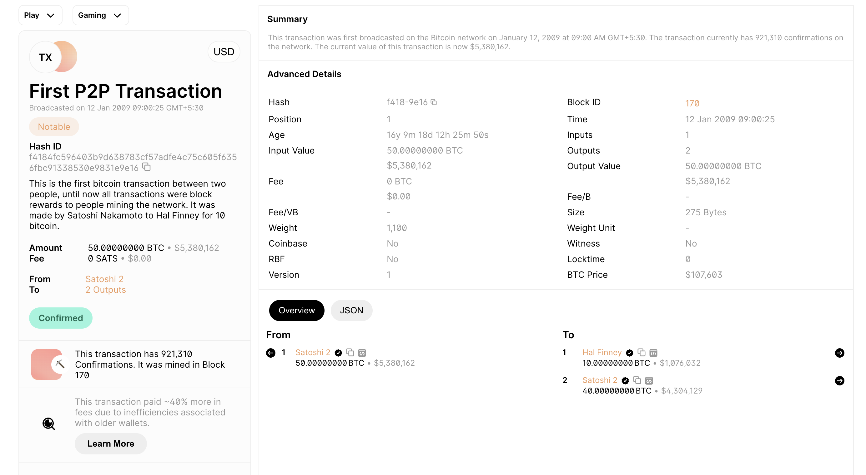 تفاصيل أول معاملة بيتكوين. المصدر: Blockchain.com