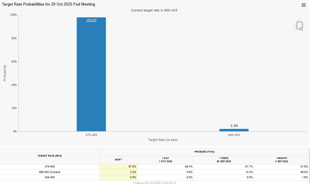 - تعززت معنويات المخاطرة مع تسعير المتداولين احتمالية كاملة تقريبًا لخفض سعر الفائدة من الاحتياطي الفيدرالي في أكتوبر، على الرغم من عدم اليقين الناتج عن الإغلاق الحكومي الأمريكي.