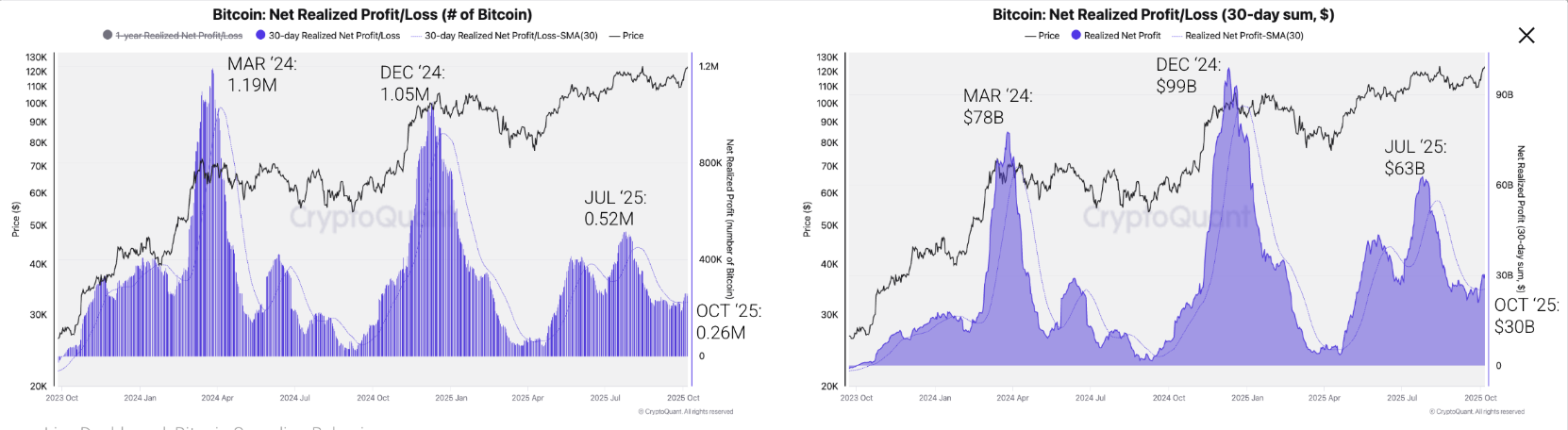 سلط تقرير كريبتو كوانت CryptoQuant يوم الأربعاء الضوء على أن نشاط جني الأرباح لا يزال عند مستويات منخفضة نسبيًا بعد أن وصل سعر البيتكوين إلى قمة تاريخية جديدة عند 126,199 دولار يوم الاثنين، مما يشير إلى أن البيتكوين قد تستمر في الارتفاع وأن القمة لا تزال غير مرئية.