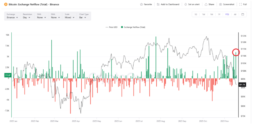 بالإضافة إلى النظرة الهبوطية، تجاوزت احتياطيات بورصة بينانس 580 ألف بيتكوين. عندما يزداد عدد عملات البيتكوين في البورصات، فإن ذلك عادةً ما يشير إلى تصاعد ضغط البيع، خاصةً عندما يكون الطلب ضعيفًا جدًا لامتصاص العرض، كما يتضح من التدفقات الخارجية المستمرة من صناديق الاستثمار المتداولة. لقد عملت هذه الديناميكية كقوة هبوطية مؤخرًا، حيث تزامنت زيادة احتياطيات بورصة بينانس مع استمرار ضعف الأسعار.
