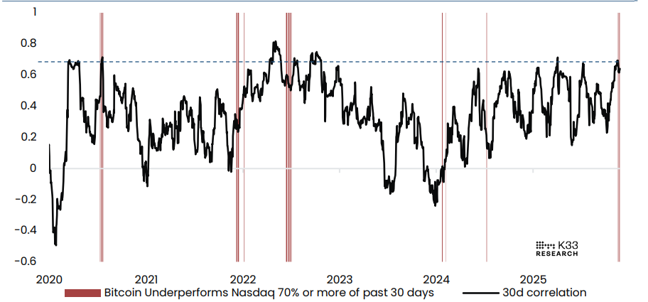أوضح التقرير أيضًا أن البيتكوين قد أدت أداءً أقل من مؤشر ناسداك (مقاسًا بواسطة صندوق QQQ المتداول التابع لشركة إنفسكو Invesco) في 21 من آخر 30 يوم تداول، أو 70% من جميع أيام التداول خلال الشهر الماضي. هذه الحالة الحالية نادرة وتمثل المرة الأولى التي يتجاوز فيها الأداء النسبي المنخفض 70% منذ يوليو/تموز 2024.
