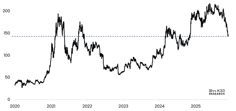 بالإضافة إلى ذلك، انخفض سعر البيتكوين بالنسبة لمؤشر QQQ إلى 143، وهو أدنى مستوى منذ 5 نوفمبر/تشرين الثاني 2024، كما هو موضح في الرسم البياني أدناه. بعبارة أخرى، تم استرداد كل القوة النسبية بعد الانتخابات الرئاسية الأمريكية. المشاركون في البيتكوين اليوم مختلفون تمامًا عن المشاركين في البيتكوين خلال فترة 2021، وحتى خلال الدفعة الأعلى في الربع الأول من 2024.