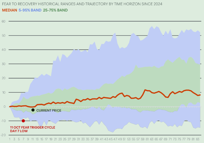 حلل التقرير مجموعة البيانات التي تغطي أكثر من 40 حدث خوف منذ عام 2024، كل منها تم تطبيعه على مدى 84 يومًا لالتقاط دورة الخوف إلى التعافي بالكامل. يعكس إعداد أكتوبر النموذج التاريخي تقريبًا بشكل مثالي: تصحيح سريع بنسبة -10%، وتماسك لمدة 11 يومًا، وانحياز إحصائي نحو تعافي بنسبة 15–30% على مدى الأسابيع 8–12 التالية. بينما لا يزال الشعور قصير الأجل حذرًا، تشير البيانات بقوة إلى أن الخوف لا يزال يمثل إعادة ضبط، وليس انعكاسًا.
