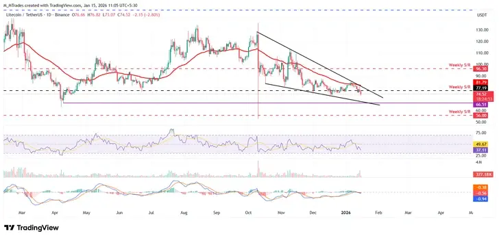 توقعات أسعار لايتكوين: LTC ينخفض إلى ما دون 75 دولار مع نشاط المحفظة الساكنة الذي يثير ضغط البيع