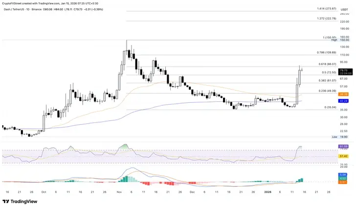 يتداول داش بالقرب من 80 دولار في وقت كتابة هذا التقرير يوم الخميس، محتفظًا بزيادة قدرها 35% منذ يوم الأربعاء، مما يعادل تقريبًا 120% من المكاسب حتى الآن هذا الأسبوع. تواجه عملة الخصوصية مقاومة من مستوى تصحيح فيبوناتشي 61.8% عند 86 دولار، والذي تم تتبعه بين أعلى مستوى في 4 نوفمبر عند 150 دولار وأدنى مستوى في 19 ديسمبر عند 35 دولار على الرسم البياني اللوغاريتمي اليومي. إذا تمكن داش من تجاوز هذا المستوى، فقد يستهدف الحاجز النفسي عند 100 دولار، يليه مستوى تصحيح فيبوناتشي 78.6% عند 109 دولار.