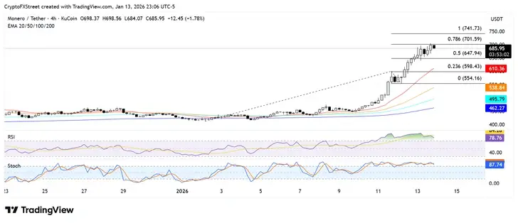واصلت مونيرو (XMR) مسيرتها الصعودية يوم الثلاثاء حيث ارتفعت إلى أعلى مستوى لها على الإطلاق عند 692 دولار. ارتفع التوكن بنحو 10% خلال الـ 24 ساعة الماضية، مما زاد مكاسبه الأسبوعية إلى أكثر من 50%. الآن، صعدت مونيرو إلى فئة أفضل 20 عملة رقمية، حيث تحتل المرتبة 15، مع قيمة سوقية تبلغ 12.2 مليار دولار في وقت النشر. بعد ارتفاع توكن الخصوصية خلال الأسبوع الماضي، حذرت منصة تحليلات العملات الرقمية سانتيمنت من أن تزايد الخوف من فقدان الفرصة (FOMO) المحيط بمونيرو قد يكون محفوفًا بالمخاطر. وأشارت المنصة إلى أن الهيمنة الاجتماعية لـ XMR بلغت ذروتها يوم الأحد، بينما انخفضت أنشطة التطوير.