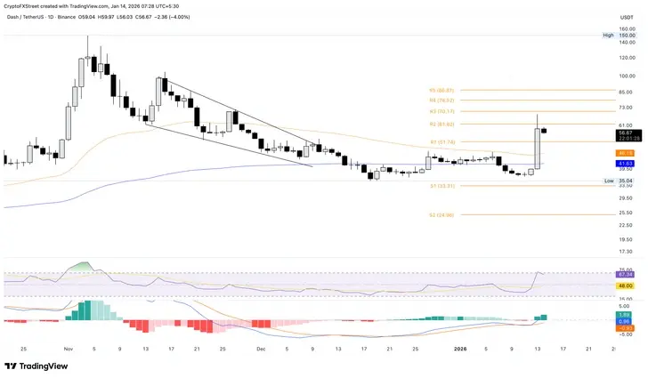 تتداول داش فوق 50 دولار في وقت النشر يوم الأربعاء، محتفظة بمكاسبها التي بلغت نحو 50% يوم الثلاثاء. تكافح العملة الخصوصية لتجاوز 60 دولار، حيث تواجه مقاومة من نقطة المحور R2 عند 61 دولار. إذا تمكنت DASH من تجاوز هذا المستوى، فقد تستهدف نقطة المحور R3 عند 70 دولار. تشير المؤشرات الفنية على الرسم البياني اليومي إلى ضغط شراء مرتفع، حيث يقع مؤشر القوة النسبية (RSI) عند 67، محلقًا بالقرب من حدود الشراء المفرط، ويشهد مؤشر تباعد وتقارب المتوسطات المتحركة (MACD) ارتفاعًا، مع أشرطة الرسم البياني التي ترتفع باستمرار.