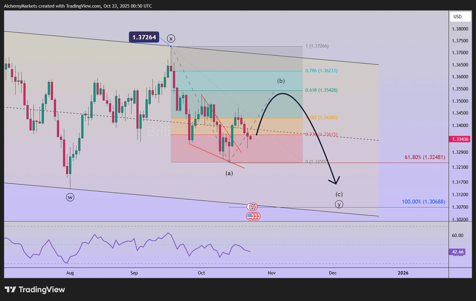 سجل زوج استرليني/دولار GBP/USD قمة موجة ((x)) في 17 سبتمبر عند 1.3726. يتناسب الانخفاض منذ 17 سبتمبر بشكل أفضل كموجة ((y)). نعلم من دراسات موجات إليوت لدينا أن هذه الموجة (y) من المحتمل أن تتشكل كنمط زجزاج (a)-(b)-(c).