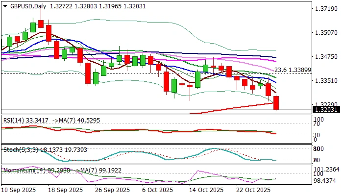 يتماسك زوج استرليني/دولار GBP/USD حول مستوى 1.3200 يوم الخميس، بعد خسائر كبيرة في الجلسة السابقة. يتداول الزوج الآن بالقرب من أدنى نقطة له منذ أبريل 2025، مع تصاعد ضغوط البيع بعد أن خفض الاحتياطي الفيدرالي أسعار الفائدة بمقدار 25 نقطة أساس. بينما قدم الخفض المتوقع، أشار رئيس الاحتياطي الفيدرالي جيروم باول إلى نبرة متشددة من خلال التأكيد على أن المزيد من التخفيف هذا العام ليس مضمونًا، مما يعزز الدولار الأمريكي.